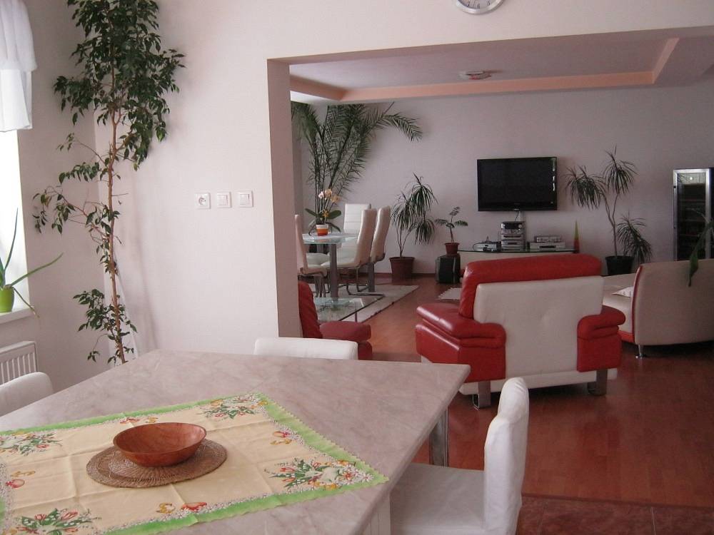 Apartmán má svůj vlastní vchod a parkování před domem. Ze vstupní haly v přízemí se vchází do obývacího pokoje, ve kterém jsou k dispozici dvě sedací soupravy s konferenčním stolkem, jídelní stůl se šesti židlemi, TV - plazma s úhlopříčkou 105 cm, s příjmem satelitu TELLY, Hi - Fi věž, DVD/VHS přehrávač, vinotéka pro uskladnění vína. Pokoj je propojen s kuchyní a jídelnou – plně vybavená kuchyňská linka s nádobím, lednice s mrazicím boxem, myčka, plynový sporák s elektrickou troubou, odsavač, mikrovlnná trouba, varná konvice, domácí pekárna, domácí výčepní zařízení na 5l soudky, velký kuchyňský stůl a šest barových židlí. Z kuchyně je přístup na venkovní terasu se zahradním nábytkem. Z haly se vstupuje též do podkroví a do suterénu. V podkroví se nachází tři ložnice, které jsou neprůchozí. Každá ze dvou menších ložnic obsahuje dvě manželské postele, skříně a TV, třetí ložnice má tři manželské postele, skříně a TV. V suterénu se nachází čtvrtá ložnice s manželskou postelí, druhý obývací pokoj s TV, kuchyňským koutem a krbem, kde jsou k dispozici další čtyři lůžka. Odtud se pak prochází na zahradu s venkovním bazénem o velikosti 3,5 x 7,5 m, kde je možné využívat ohniště, gril, posezení, pískoviště, domeček pro děti, hračky na písek, kočárek s panenkou, stolní tenis, stolní fotbal, trampolínu a skluzavku. Zahrada sousedí s výběhem pro naše hodné ovečky. V přízemí se nachází koupelna s rohovou vanou, umyvadlem a pračkou a samostatné WC, v podkroví sprchový kout, umyvadlo a WC a v suterénu dvě WC a koupelna se sprchovým koutem. Pro děti jsou v apartmánu k dispozici knížky, hračky, společenské hry a počítač.
